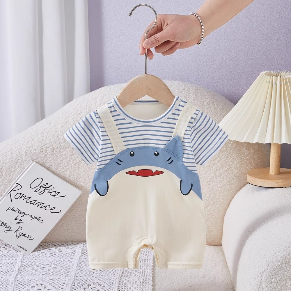 Keep your little one stylish and comfortable with our charming baby shark print romper, designed...