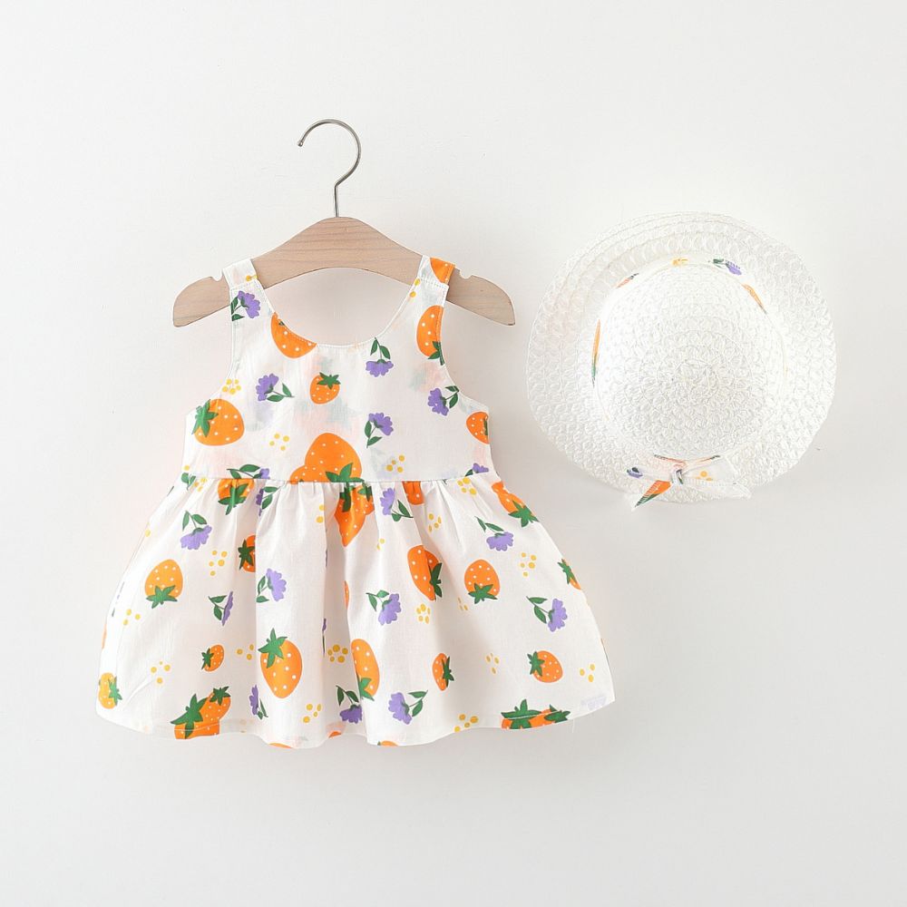 Casual Dress Large Bow Pure Cotton Frock For Baby Girl Strawberry Print With Hat