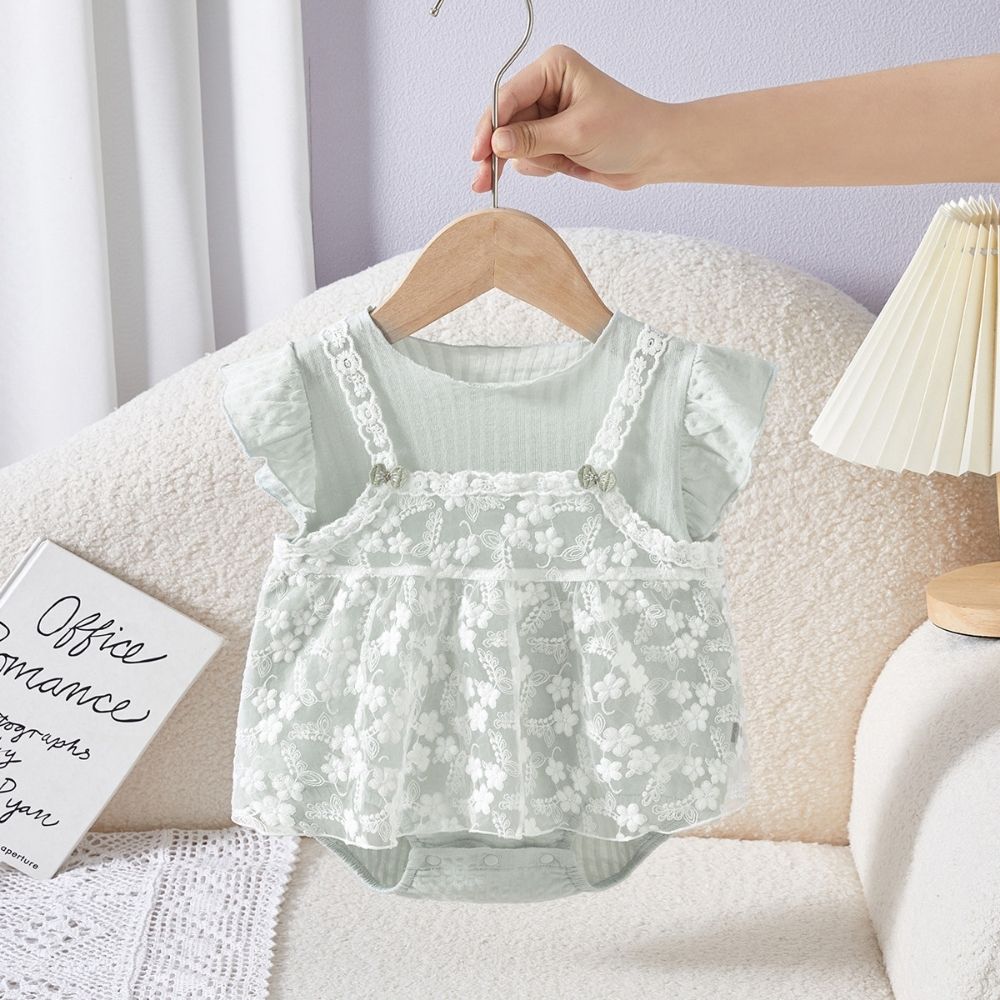 White Lace Overlay Light Green Baby Girl Romper