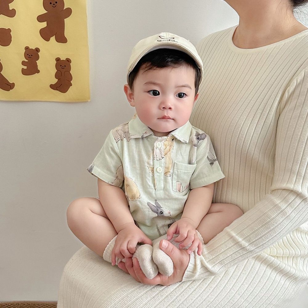 Rabbit Pattern Short-Sleeved Baby Romper with Collar & Button-Up Front Keep your little one comfortable...