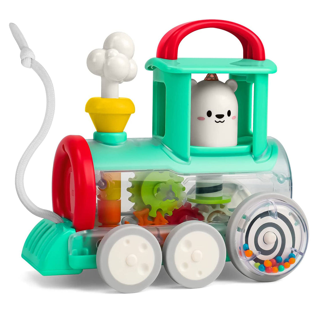 Gently pull the traction rope, this toy train will move forward and transparent wheels make...