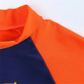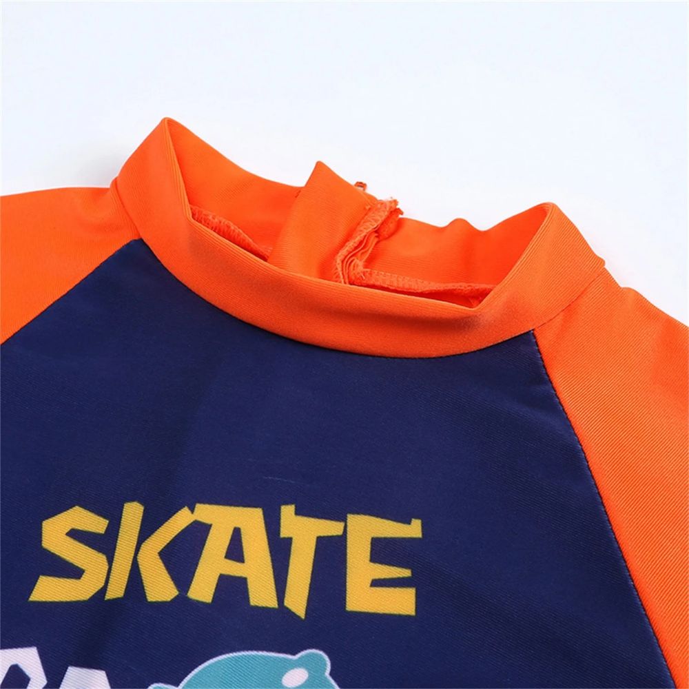 Make summer water fun even cooler with this Baby Boys Skateboard Dino Rash Guard Swimsuit Set. This adorable one-piece swimsuit features a fun graphic of a dinosaur riding a skateboard along with the playful text “SKATE BOARD dino” and “COOL BOY.” The stylish navy blue and orange colour combination adds a sporty and energetic look, perfect for little adventurers.