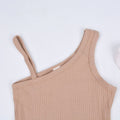 Style: Features a charming beveled one-shoulder sleeveless tank top paired with solid color shorts. The simple yet stylish design makes it a perfect summer outfit for your toddler girl.