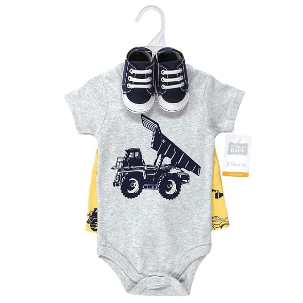 Gear up your little one in this adorable construction-themed set! Perfect for everyday wear, this Hudson Baby set includes a comfy bodysuit, matching shorts, and soft shoes, all designed for your baby's comfort and style.