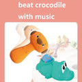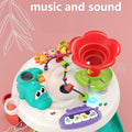 Interactive Musical Activities: Features a light-up piano with colorful keys, musical notes, and numbers, a tappable drum, a strum-able guitar, and a spin-able French horn — all designed to introduce basic concepts while encouraging musical exploration.