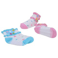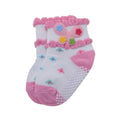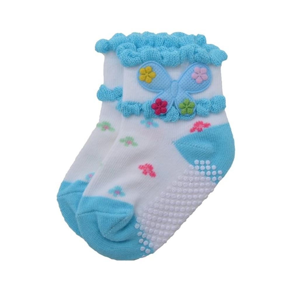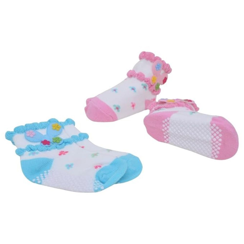 These charming baby socks feature sweet ruffled ankle cuffs in pink and blue, adding an adorable touch to any outfit. The front is decorated with tiny, colourful flower and butterfly appliques, perfect for little ones. The main body of the socks is white with delicate scattered floral patterns, enhancing their cute and charming appeal.
