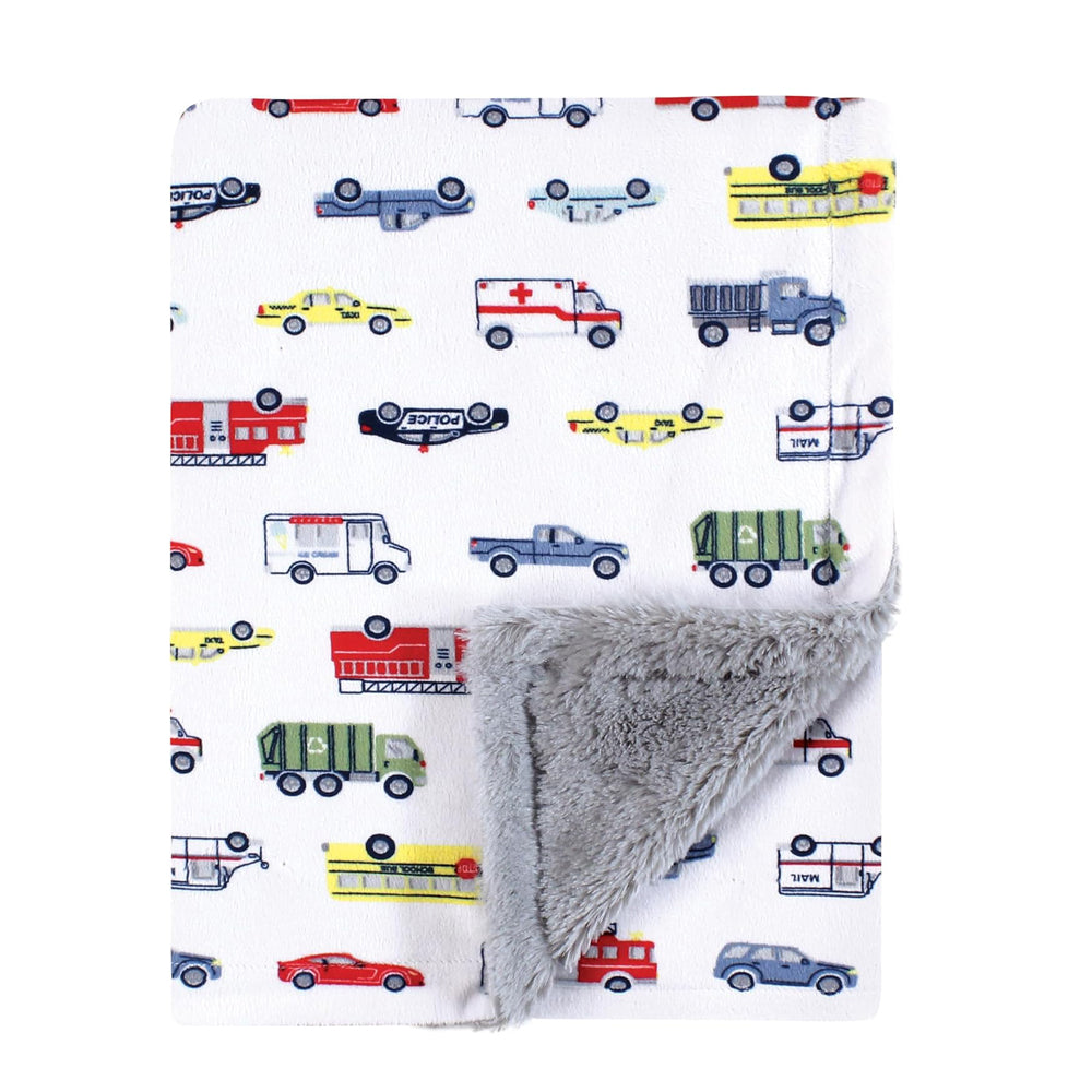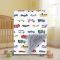- Reversible Design: One side features a charming printed plush with colourful vehicles like cars, ambulances, and fire trucks, while the reverse side boasts a plush, solid-colored sherpa fleece for extra warmth.