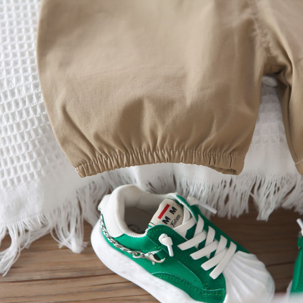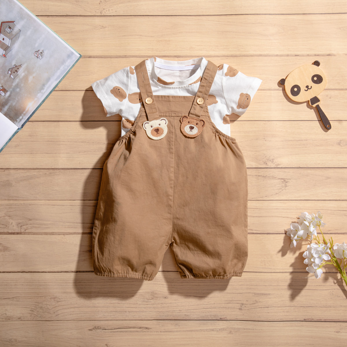 - The T-shirt and dungaree overall set creates a casual and comfortable look
