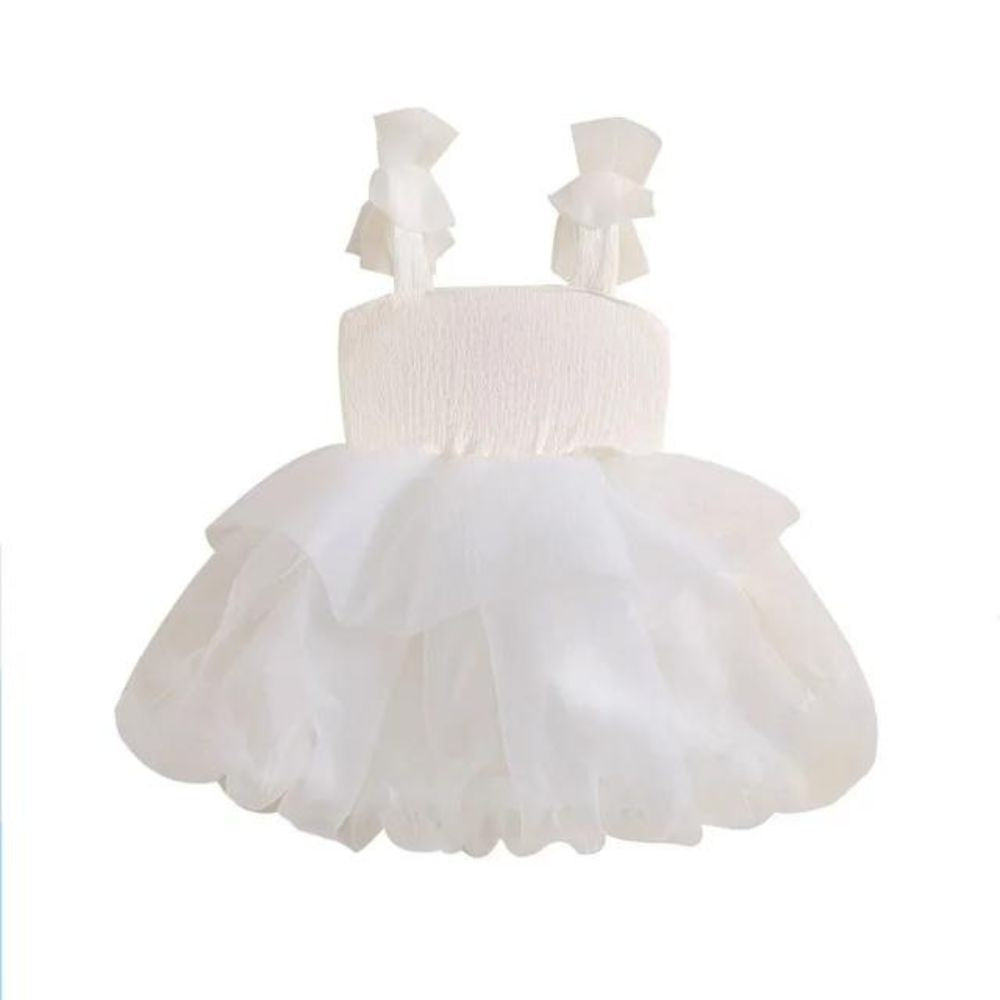 Discover elegance with our White Sleeveless Ruffled Party Designer Frock for Baby Girls. Adorned with two adorable bow embellishments on the shoulder straps, it's perfect for birthdays and special occasions. Crafted for comfort and charm, this frock promises softness and a delightful appearance, ensuring your little one looks both cute and beautiful effortlessly.